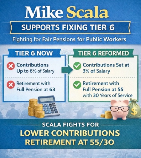 Public workers deserve dignity and respect. Most public employees hired in or after April 2012 fall under Tier 6, which requires pension contributions of up to 6 percent of their pay and delays full retirement benefits until age 63. To restore fairness and parity with earlier tiers, contribution rates should be standardized at 3 percent, and workers should be able to retire at age 55 with 30 years of service.